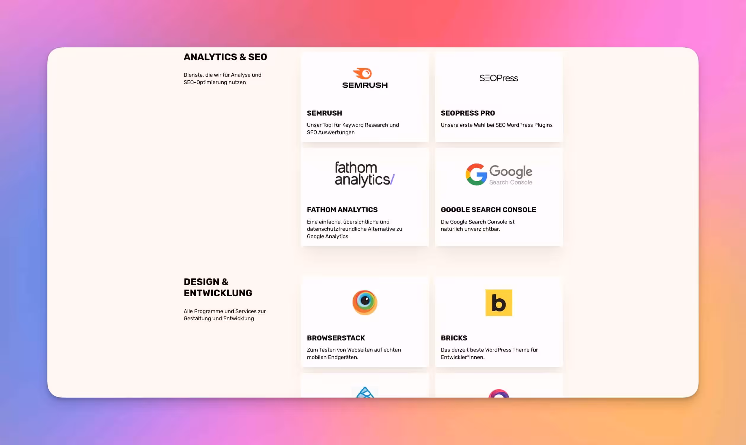Um für neue Kund*innen und Agenturen transparenter in unserer Arbeitsweise sein zu können, haben wir uns dazu entschieden eine Übersicht unserer Tools, Plugins, Dienstleister*innen zu veröffentlichen. Ihr könnt euch nun auf der Seite Tools einen Einblick in unseren Stack verschaffen.…...